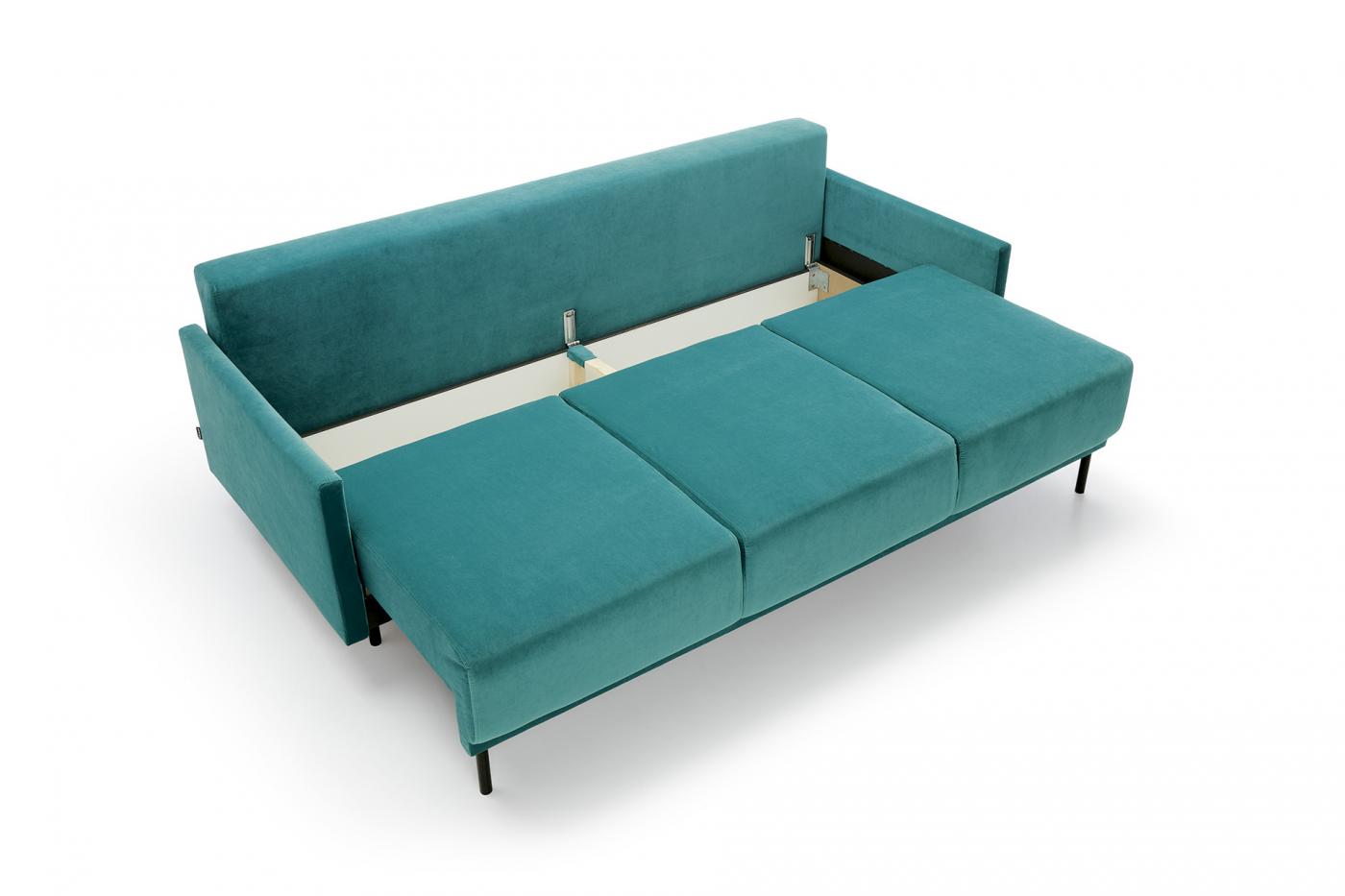 Canapeaua cu trei locuri nu servește doar ca un loc confortabil, ci și ca un spațiu suplimentar pentru dormit. După desfășurare, modelul Solo se transformă într-un pat confortabil de dimensiuni generoase, iar desfășurarea este rapidă și plăcută datorită mecanismului automat DL. În plus, canapeaua are un container practic în care puteți depozita lenjeria de pat, pături sau alte lucruri pe care nu le utilizați zilnic. Șezutul este umplut cu spumă foarte elastică și un arc ondulat pentru a asigura confort maxim. Pernele moi ale spătarului adaugă un avantaj suplimentar, permițându-vă să vă relaxați confortabil în timp ce citiți cartea preferată sau vizionați un film. Canapeaua modernă Solo stă pe picioare înalte, drepte, conferindu-i ușurință și contribuind la menținerea unui aspect ordonat. Un robot de curățare sau un aspirator pot fi ușor manevrate sub canapea.