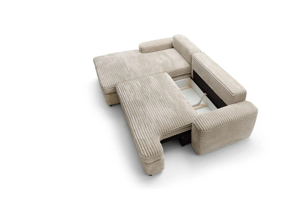 🧺 Organizare Practică: Sub șezut se regăsește un recipient spațios pentru așternuturi, oferind o soluție eficientă pentru depozitarea pernelor și a păturilor, menținând livingul ordonat fără efort.