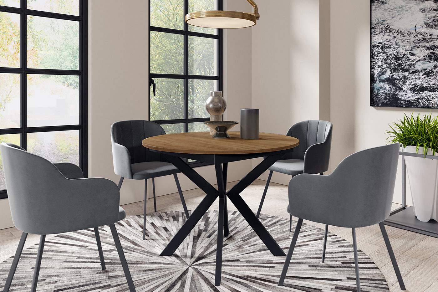 🎨 Design Loft-Chic: Contrastul dintre nuanța sobră de Stejar Lefkas și rigoarea metalului negru oferă piesei un caracter modern și sofisticat, integrându-se perfect în amenajările industriale, clasice sau contemporane.