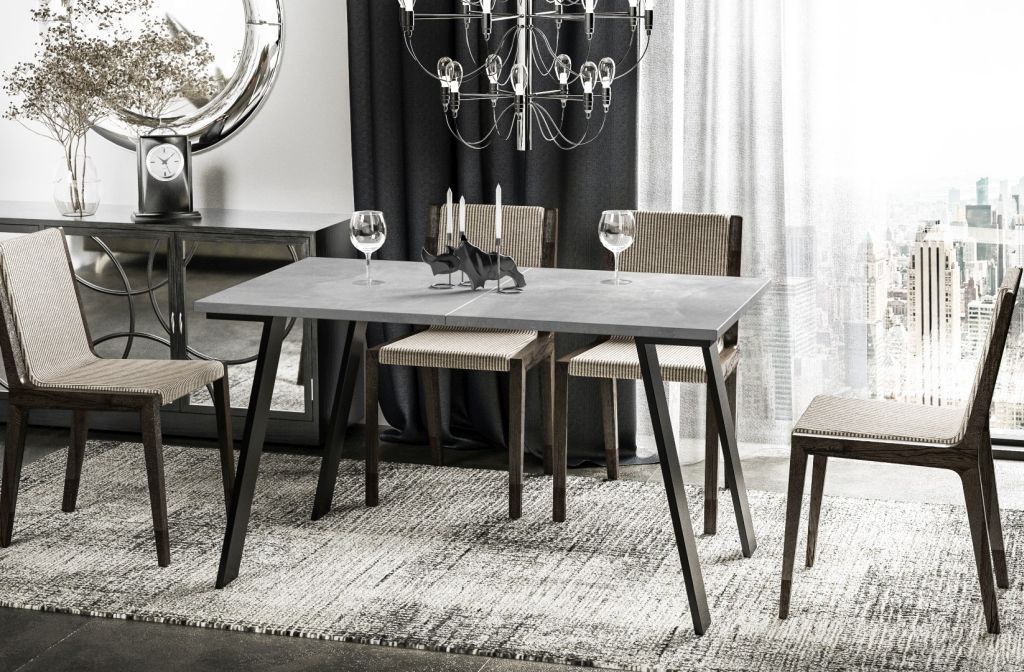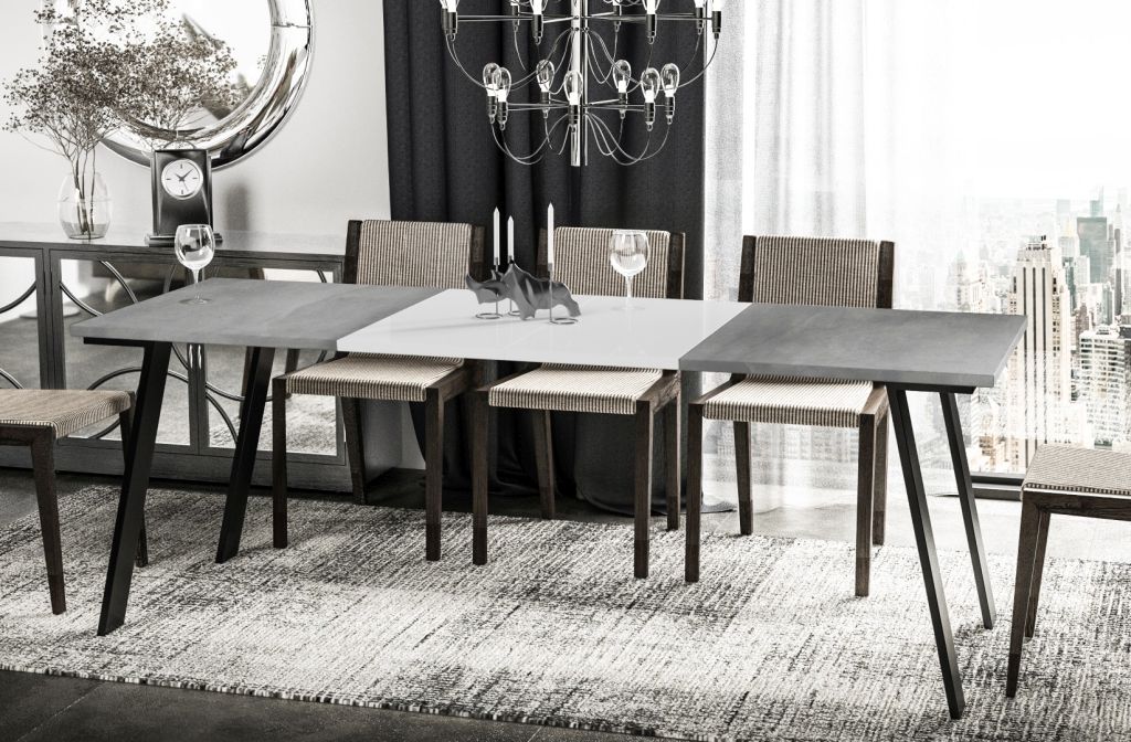 🎨 Contrast Modern (Beton & Alb Lucios): Combinația unică dintre textura de beton și plăcile de extensie alb lucios oferă mesei un caracter dinamic, transformând-o dintr-o piesă sobră într-una luminoasă atunci când este extinsă.