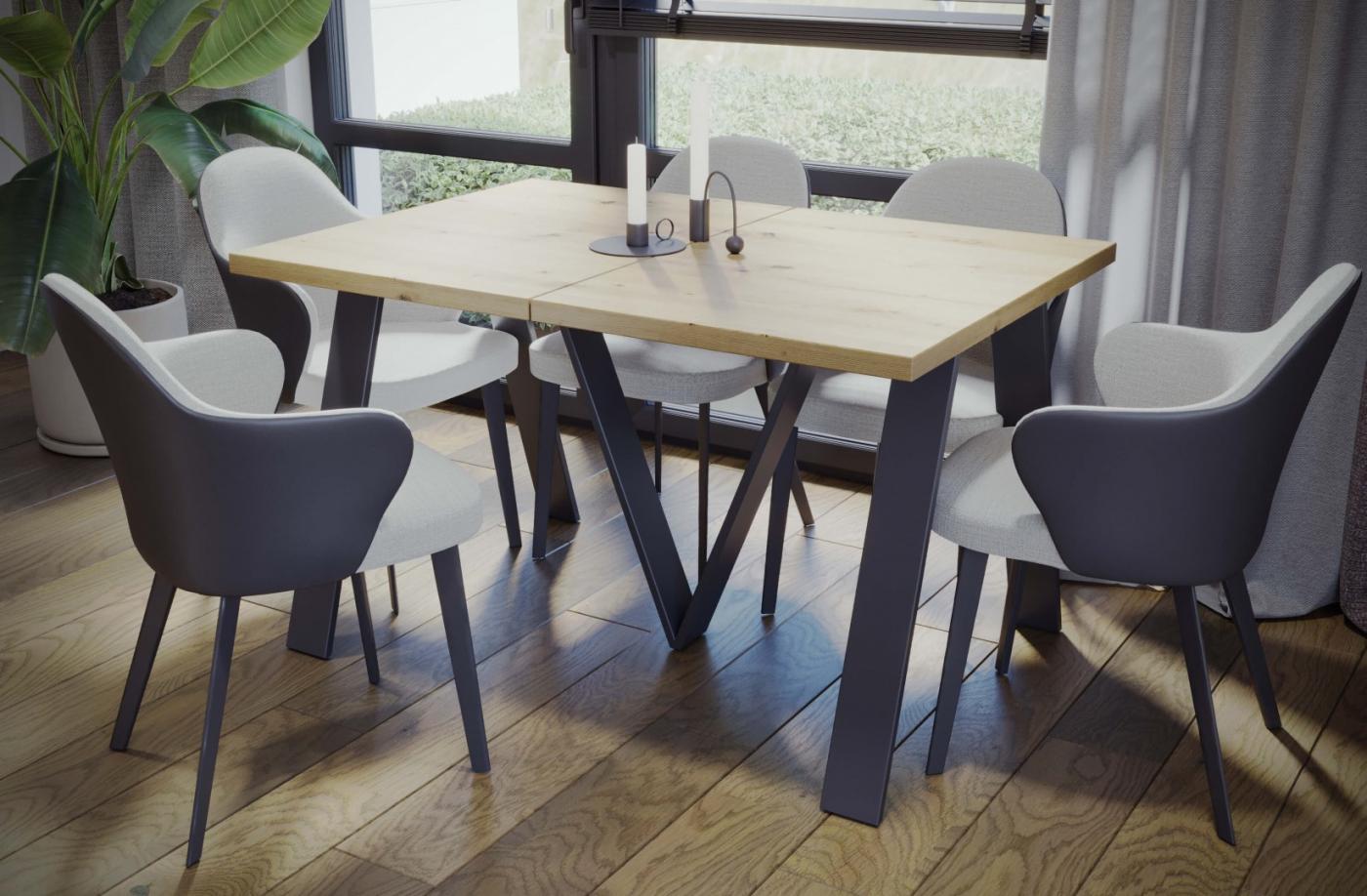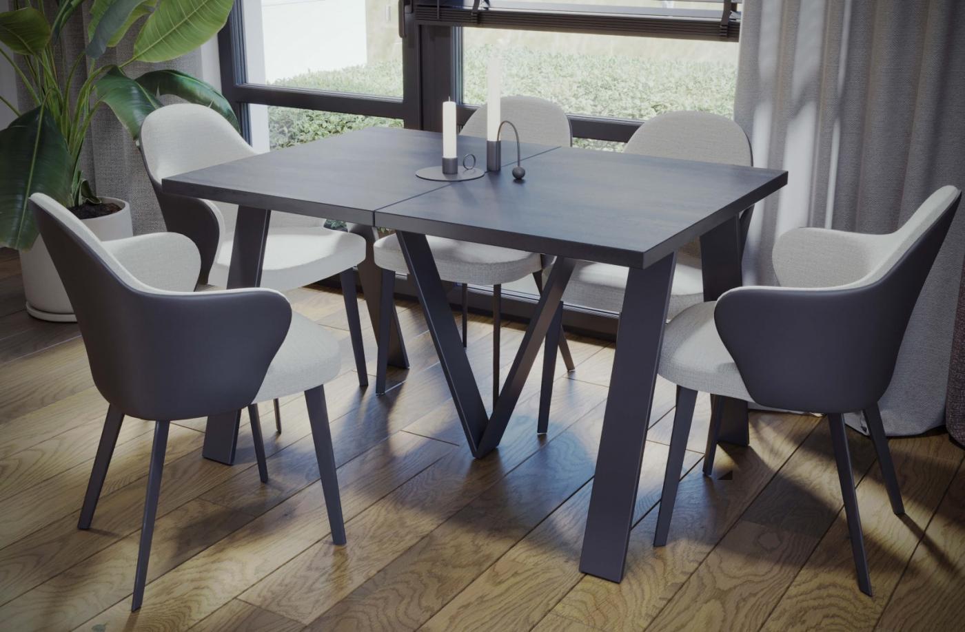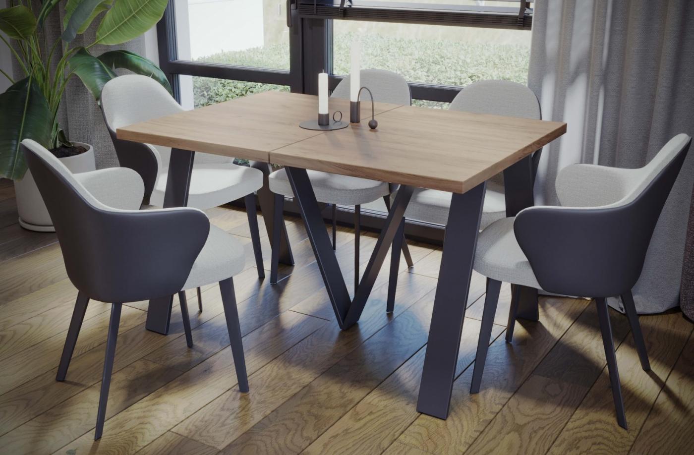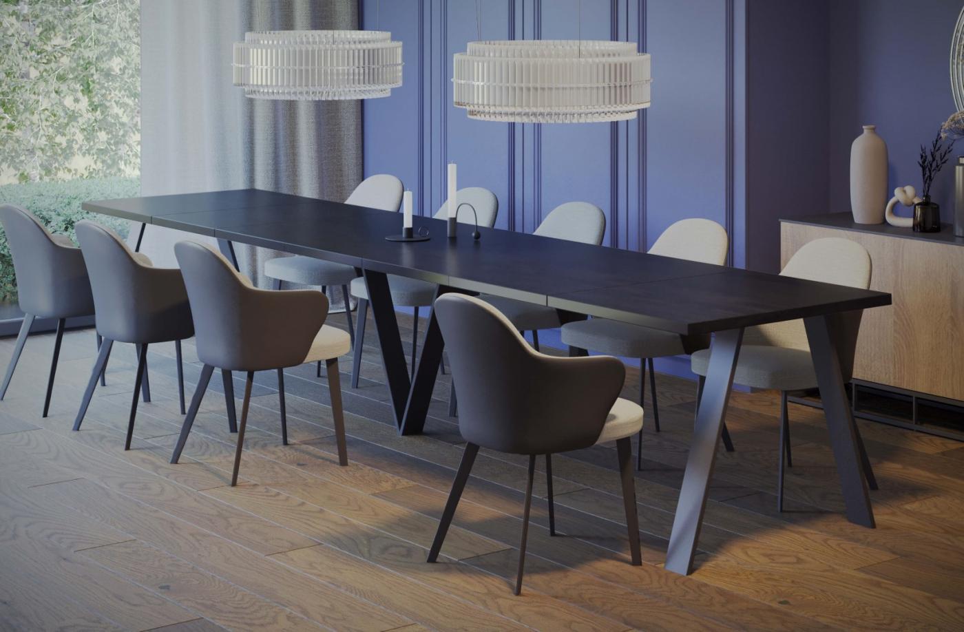 Cu o lungime de până la 405 cm, masa de sufragerie oferă suficient spațiu pentru până la 12 persoane și, prin urmare, este ideală pentru familii numeroase sau seri sociale cu prietenii. Datorită manoperei stabile și robuste, precum și blatului de masă din furnir de înaltă calitate și durabil, masa este deosebit de robustă și durabilă. Rama elegantă din metal negru mat subliniază designul modern al mesei. Plăcile de extensie pot fi introduse individual pentru a personaliza masa.
