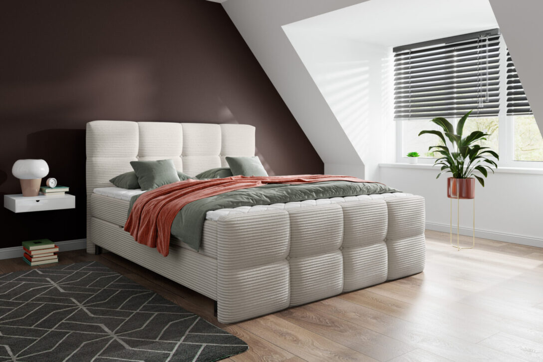 - Cutie de depozitare de 20 cm: Patul este echipat cu o cutie de depozitare cu o înălțime de 20 cm, accesibilă prin ascensoare cu gaz, facilitând depozitarea eficientă a obiectelor personale și menținând dormitorul ordonat.