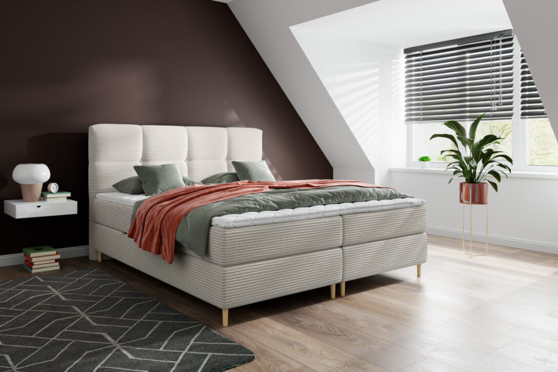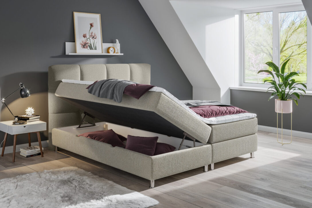 - Cutie de depozitare de 20 cm: Patul este echipat cu o cutie de depozitare cu o înălțime de 20 cm, accesibilă prin ascensoare cu gaz, facilitând depozitarea eficientă a obiectelor personale și menținând dormitorul ordonat.