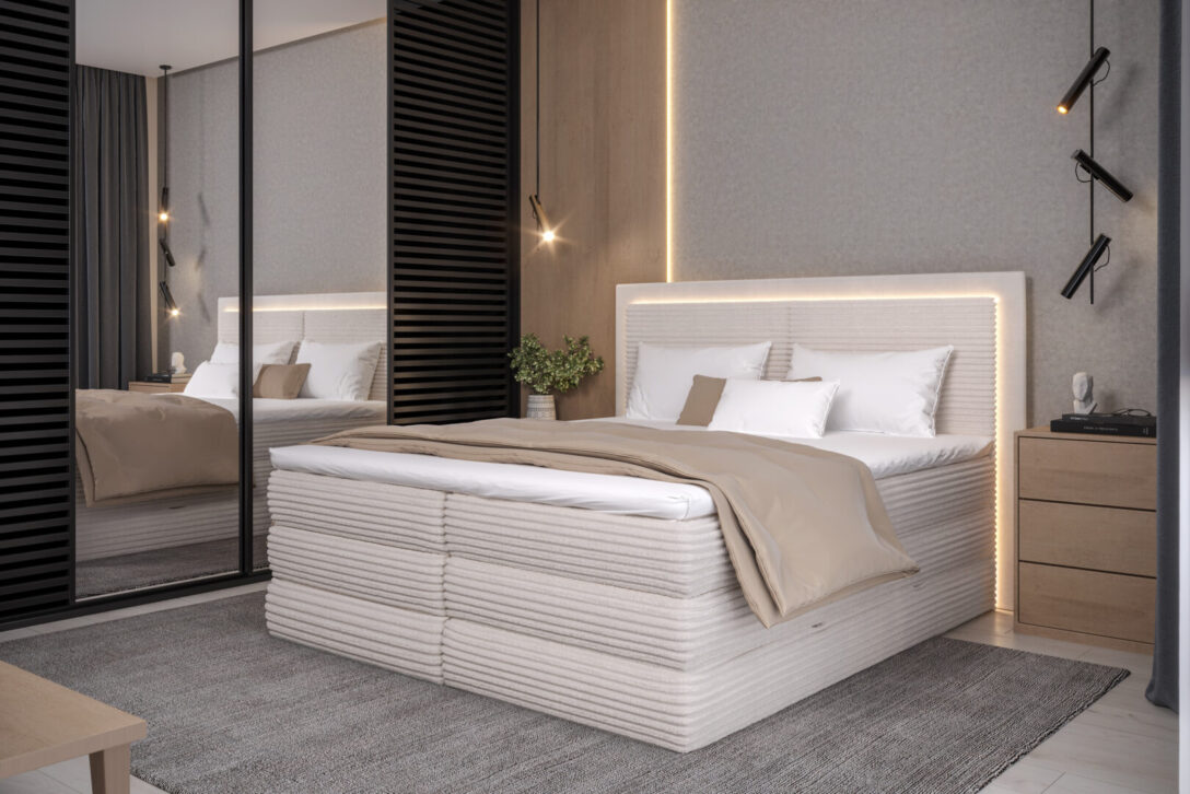 - Tăblie de 130 cm, tapițată și matlasată, dotată cu LED-uri integrate, pentru un aspect modern și o atmosferă relaxantă.